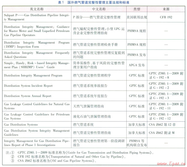 燃?xì)夤艿劳暾怨芾矸ㄒ?guī)和標(biāo)準(zhǔn)是實(shí)施管道完整性管理的重要指導(dǎo)性文件。為了有效推進(jìn)燃?xì)夤艿劳暾怨芾砉ぷ?,美?guó)、加拿大等國(guó)家燃?xì)夤芾砗脱芯繖C(jī)構(gòu)制定了相關(guān)的法規(guī)和標(biāo)準(zhǔn),主要的法規(guī)和標(biāo)準(zhǔn)見表l。表l中APGA是美國(guó)公共燃?xì)鈪f(xié)會(huì)的簡(jiǎn)稱,GPTC是美國(guó)燃?xì)鈪f(xié)會(huì)(簡(jiǎn)稱AGA)的下屬機(jī)構(gòu)燃?xì)夤艿兰夹g(shù)委員會(huì)的簡(jiǎn)稱。