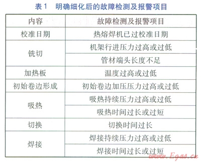 GB/T 20674.1—2006對自動熱熔焊機(jī)故障檢測項目的要求較為概括,因此我們對自動熱熔焊機(jī)的故障檢測及報警項目進(jìn)行明確細(xì)化(見表l)。