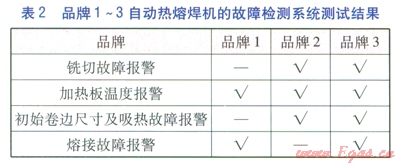 品牌l、2自動熱熔焊機(jī)的故障檢測系統(tǒng)不完整,即使焊接參數(shù)不符合標(biāo)準(zhǔn)也可允許焊接繼續(xù)進(jìn)行。品牌l~3自動熱熔焊機(jī)的故障檢測系統(tǒng)測試結(jié)果見表2。由表2可知,品牌1、2自動熱熔焊機(jī)未對表2中列舉的所有故障作出報警提示。