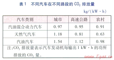 表1表明:a.在城市內(nèi)行駛,汽油混合動(dòng)力汽車(chē)是最清潔的。b.在農(nóng)村地區(qū)、高速公路上行駛時(shí)(車(chē)速快,發(fā)動(dòng)機(jī)工作),在二氧化碳減排方面,純天然氣汽車(chē)優(yōu)于汽油汽車(chē)、汽油混合動(dòng)力汽車(chē)。