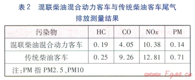 中國(guó)汽車(chē)技術(shù)研究中心與武漢理工大學(xué)等單位采用同規(guī)格的一輛混聯(lián)柴油混合動(dòng)力客車(chē)與一輛傳統(tǒng)柴油客車(chē),在北京通州區(qū)交通部公路試驗(yàn)場(chǎng)內(nèi),參照《重型混合動(dòng)力電動(dòng)汽車(chē)能量消耗量試驗(yàn)方法》(GB/T l9754—2005)及美國(guó)SAE—J2711標(biāo)準(zhǔn)《混合動(dòng)力重型車(chē)輛排放性能測(cè)試》進(jìn)行了指定工況下的混合動(dòng)力汽車(chē)場(chǎng)地排放測(cè)試,結(jié)果見(jiàn)表2。
