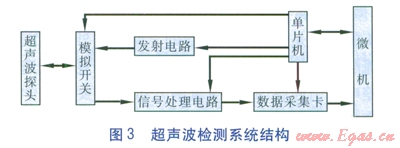 超聲波的檢測系統(tǒng)結構見圖3,超聲波檢測系統(tǒng)主要以單片機為控制核心,數據的采集、處理、顯示由微機完成。單片機控制發(fā)射電路發(fā)出窄脈沖,激勵超聲波探頭發(fā)出超聲波,并隨之切換開關,切換到接收回路。然后啟動數據采集卡進行數據采集,經過微機處理后顯示分析結果。超聲波檢測技術測量精度高,能分辨管內壁和外壁腐蝕,不受管材約束,能夠測量漸變腐蝕。但該檢測技術存在檢測盲區(qū),且只能對光潔表面檢測,還需要耦合劑。