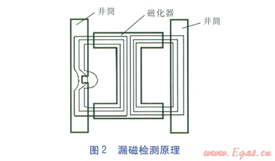 漏磁檢測系統(tǒng)由電源、磁化裝置、檢測探頭、A/D模塊、計算機等組成。井筒壁被磁化裝置磁化后發(fā)出電磁信號,該信號被檢測探頭檢出,再由A/D模塊采集,最后在計算機中顯示分析結果。該檢測技術對突變缺陷敏感,無檢測盲區(qū),能對管壁進行全面檢測,對表面光潔度要求低,不需要耦合劑。缺點是測量精度低,受管材限制,不能夠測量漸變腐蝕。