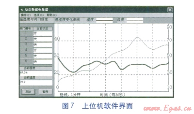 上位機可以方便地實現(xiàn)與單片機之間的交互,實現(xiàn)操作可視化,更加直觀,便于實現(xiàn)保存數(shù)據(jù)等功能。上位機軟件采用Visual Basic 6.0編寫。上位機軟件界面見圖7。在上位機的邏輯處理中,可以參照不同的要求,對溫濕度的處理時間步長進行人為設定。步長越小,調(diào)控越精密,越準確。反之,步長越大,調(diào)控較為粗略,但仍可以在人體的舒適范圍內(nèi)。