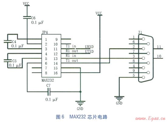 MAX232芯片是美信(MAXIM)公司專為RS232標準串口設計的單電源電平轉(zhuǎn)換芯片,使用5V單電源供電。通過MAX232電平轉(zhuǎn)換芯片將單片機TTL電平轉(zhuǎn)換為RS232電平,實現(xiàn)單片機與上位機的串行通信[4]。MAX232芯片電路見圖6。MAX232芯片的Tl in、Rl out引腳與單片機連接,Rl in、Tl out引腳與Jl(與上位機的串行接口)連接,其他引腳為一般常見接法。