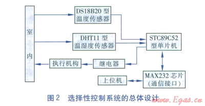 選擇性控制系統(tǒng)的設計思路是在優(yōu)先保證室內(nèi)溫度達到預設值的前提下,調(diào)節(jié)室內(nèi)空氣相對濕度以最大限度地降低空調(diào)系統(tǒng)能耗。溫濕度傳感器實時測量室內(nèi)空氣的溫濕度,并通過串行接口將溫濕度信號傳至單片機,單片機將接收到的溫濕度信號與內(nèi)部預置及計算的溫濕度范圍進行比較判定,并將實時溫濕度信號通過通信接口上傳至上位機顯示。在單片機比較判定結束后,將控制信號傳遞給繼電器,繼電器通過控制執(zhí)行機構在優(yōu)先滿足室內(nèi)溫度需要的前提下,進行室內(nèi)空氣相對濕度調(diào)節(jié)[4]。選擇性控制系統(tǒng)的總體設計見圖2。