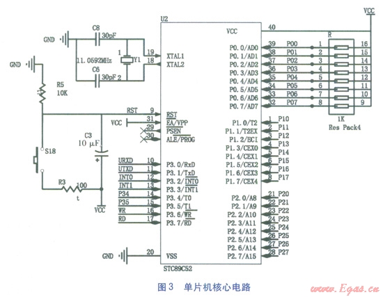 STC89C52型單片機是由STC公司生產(chǎn)的一種低功耗、高性能產(chǎn)品。采用ATMEL高密度非易失儲存器技術制造,與工業(yè)標準的MCS-51指令集和輸出引腳兼容。單片機核心電路見圖3。主要引腳功能:XTALl、XTAL2引腳為晶振接口,RST引腳為上電復位接口,P0系列引腳為上拉電阻接口,P21引腳為DHTll型溫濕度傳感器接口,P22引腳為DSl8820型溫度傳感器接口,URXD、UTXD引腳為與上位機的通信接口,其他引腳為備用。