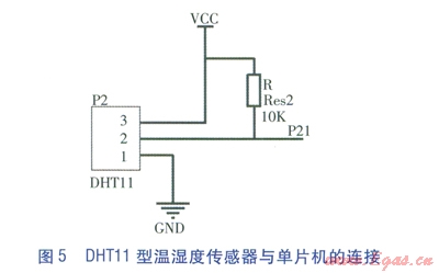 DHTll型溫濕度傳感器(由于其測溫范圍較窄,精度欠佳,因此選擇性控制系統(tǒng)只利用其測相對濕度功能)是一款含有已校準數(shù)字信號輸出的單總線制溫濕度傳感器。DHTl l型溫濕度傳感器包括1個電阻式感濕元件、1個NTC測溫元件[5]。測量范圍:相對濕度20%~90%,溫度0~50℃。DHTll型溫濕度傳感器與單片機的連接見圖5。引腳1為地線接口,引腳2為數(shù)據(jù)通信線接口,引腳3為電源線接口。