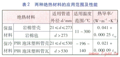 在充分比較各種絕熱材料性能后,結(jié)合表l給出的操作溫度范圍,保溫材料選用巖棉,保冷材料選用聚異氰脲酸酯(Polyisocyanurate Foam,PIR)泡沫塑料,兩種絕熱材料的應(yīng)用范圍及性能見(jiàn)表2,表中tcp為界面間平均溫度,單位為℃。