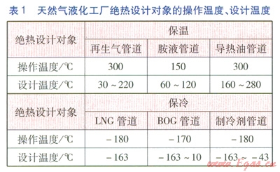 在天然氣液化工廠絕熱設(shè)計(jì)中,一般考慮對(duì)再生氣、胺液、導(dǎo)熱油等管道進(jìn)行保溫,對(duì)LNG管道、BOG管道、制冷劑管道進(jìn)行保冷。天然氣液化工廠絕熱設(shè)計(jì)對(duì)象的操作溫度、設(shè)計(jì)溫度見(jiàn)表l。