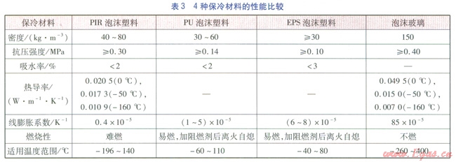 PIR泡沫塑料是一種深冷型保冷材料,具有優(yōu)良的耐熱性、耐寒性及阻燃性。與其他3種常用保冷材料的性能比較見(jiàn)表3。由于Pu(聚氨酯)泡沫塑料、EPS(可發(fā)性聚苯乙烯)泡沫塑料的適用溫度范圍不滿足天然氣液化工廠保冷工況下的操作溫度,因此未給出具體的熱導(dǎo)率。由表l、3可知,只有PIR泡沫塑料、泡沫玻璃適用于天然氣液化工廠保冷工況,但由于泡沫玻璃的線膨脹系數(shù)較大(對(duì)溫度變化敏感),因此宜采用PIR泡沫塑料。
