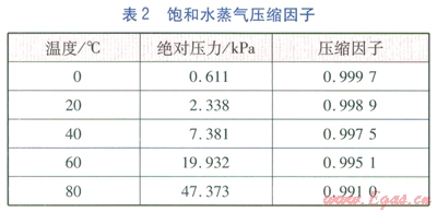 我公司橋東煤氣儲(chǔ)配站的人工煤氣來(lái)自邢臺(tái)旭陽(yáng)焦化有限公司,經(jīng)過(guò)脫萘、脫硫凈化處理后,主要組成見(jiàn)表l。經(jīng)站區(qū)流量計(jì)計(jì)量,進(jìn)入管網(wǎng),輸送至用戶,日均供氣量為17×104m3/d左右,用氣高峰期可達(dá)24×104m3/d。主干管采用DN 600mm的螺旋焊縫鋼管,長(zhǎng)度約l0km,管網(wǎng)運(yùn)行壓力為30~70kPa。在計(jì)量處測(cè)人工煤氣溫度,經(jīng)統(tǒng)計(jì),濕煤氣的溫度不超過(guò)50℃,處于水飽和狀態(tài)。表2為0~80℃的飽和水蒸氣壓縮因子值[1]。由表2可知,當(dāng)溫度不超過(guò)80℃,水蒸氣的飽和蒸氣壓很低,飽和水蒸氣壓縮因子與l的偏差小于1%,趨于理想氣體性質(zhì)。