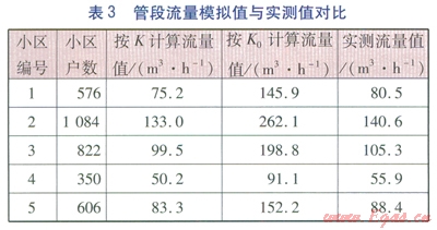 為了驗(yàn)證計(jì)算得到的同時工作系數(shù)的準(zhǔn)確性,下面分別利用同時工作系數(shù)K與K計(jì)算該地區(qū)5個小區(qū)的管段流量,并將結(jié)果與實(shí)測流量值進(jìn)行對比,見表3。