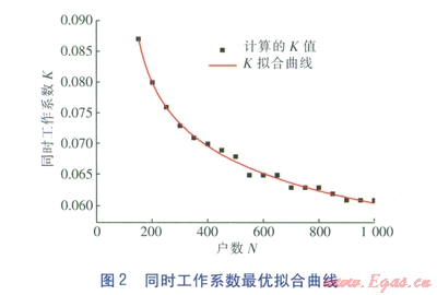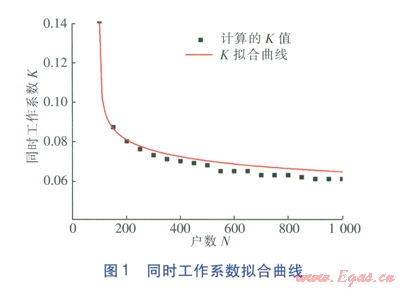 此式仍然滿足同時工作系數(shù)的一般規(guī)律,而且加冪運(yùn)算使得K隨Ⅳ的變化而變化的敏感性提高。當(dāng)置信區(qū)間P較小時,計(jì)算誤差對整個運(yùn)算的影響逐漸減小,故而造成的波動也越來越小。針對此地區(qū)的同時工作系數(shù)在置信區(qū)間P=[0.99,1)時,將計(jì)算出來的離散數(shù)據(jù)擬合成曲線的函數(shù)關(guān)系,將表1中的數(shù)據(jù)作為依據(jù)進(jìn)行擬合,得到戶數(shù)與同時工作系數(shù)的擬合結(jié)果,見圖1。