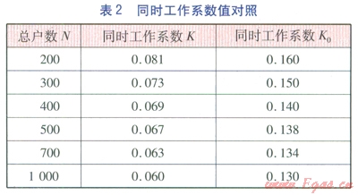 將計(jì)算結(jié)果與GB 50028—2006((城鎮(zhèn)燃?xì)庠O(shè)計(jì)規(guī)范》附錄F中推薦的同時工作系數(shù)值(設(shè)為K0)進(jìn)行對照,見表2。