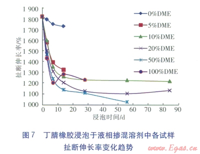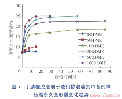 ③丁腈橡膠是一種合成橡膠,屬交聯(lián)聚合物,它在二甲醚摻混液中的溶脹都屬于有限溶脹。液相摻混液對丁腈橡膠的腐蝕,主要發(fā)生在浸泡的前10d左右的時(shí)間里,之后溶脹現(xiàn)象都趨于平穩(wěn)。