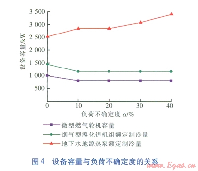 在上述5種工況的優(yōu)化配置方案中,各種設(shè)備的優(yōu)化容量與負(fù)荷不確定度的具體關(guān)系見圖4,其中,溴化鋰機(jī)組和熱泵機(jī)組僅給出了額定制冷量。由圖4可以看出,隨著負(fù)荷不確定度a的增加,地下水地源熱泵機(jī)組的額定制冷量因考慮極限工況而逐漸增大,而微型燃?xì)廨啓C(jī)發(fā)電機(jī)組和煙氣型溴化鋰機(jī)組的容量在考慮負(fù)荷不確定性后反而有所減小。這是因?yàn)轸敯魞?yōu)化配置避免了在負(fù)荷需求偏小時(shí)出現(xiàn)由于所有設(shè)備容量均增大而引起的年總費(fèi)用后悔值增大的情況,從而降低了系統(tǒng)的優(yōu)化配置方案在實(shí)際運(yùn)行時(shí)的經(jīng)濟(jì)風(fēng)險(xiǎn),使其更具經(jīng)濟(jì)魯棒性。