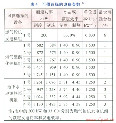 系統(tǒng)可供選擇的設(shè)備參數(shù)見表4。在計(jì)算中,貸款年利率取5.94%,設(shè)備的使用年限統(tǒng)一取l5a。分時(shí)電價(jià)為:10:00~15:00、18:00~21:00為峰段,電價(jià)l.0125元/(kW·h);23:00~7:00為谷段,電價(jià)0.3535元(kW·h);7:00—10:00、15:00~18:00、21:00~23:00為平段,電價(jià)0.6725元/(kW·h)。氣價(jià)取l.85元/m3,天然氣低熱值取35.2 MJ/m3。燃?xì)廨啓C(jī)模型中的系數(shù)取值見文獻(xiàn)