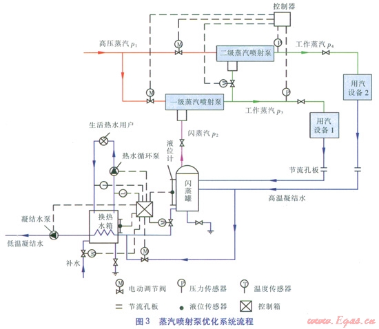 優(yōu)化系統(tǒng)與基本系統(tǒng)比較,采取了以下改進(jìn)措施:增加了二級蒸汽噴射泵,滿足不同壓力等級用汽設(shè)備的需求。利用凝結(jié)水余熱加熱生活熱水。采用節(jié)流孔板代替疏水閥。完善了自動控制系統(tǒng),可適應(yīng)用汽設(shè)備變負(fù)荷工況需求。