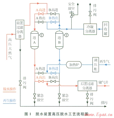脫水操作流程:被壓縮后的高壓天然氣經(jīng)前置過濾分離器分離可能存在的游離水、油和雜質(zhì),然后經(jīng)A高進(jìn)閥從塔A頂部進(jìn)入,與塔內(nèi)分子篩充分接觸,分子篩吸附高壓天然氣所含的水和部分烴得到干燥的天然氣,干燥后的天然氣從塔A底部排出,經(jīng)A高出閥進(jìn)入后置過濾分離器分離后進(jìn)入高壓儲氣容器。后置過濾分離器主要濾掉氣流中攜帶的分子篩粉末,以免堵塞后續(xù)設(shè)備。