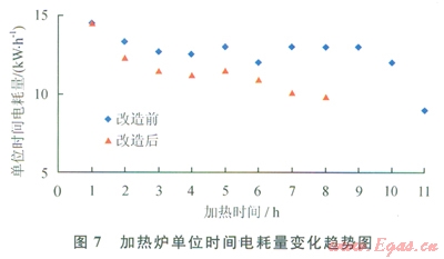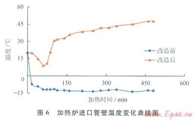 分析上述圖表數(shù)據(jù)可以得出:①改造后加熱時間減少了27.3%,再生氣用量減少了18.4%,加熱爐電耗量減少了28.6%;②由于再生氣余熱是一個自身循環(huán)預(yù)熱的過程,大約lh之后,換熱爐才開始對再生氣預(yù)熱,隨后加熱爐進(jìn)口溫度緩慢升高,最后管壁溫度穩(wěn)定在47℃左右;③再生氣余熱利用存在滯后,隨著換熱器逐漸換熱,加熱爐單位時間電耗量相比改造前電耗減小,充分說明再生氣余熱得到利用,達(dá)到了節(jié)能運行的目的。