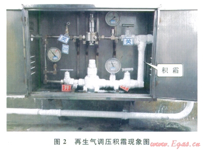 由脫水裝置工藝流程知,再生氣從塔A頂部排出時攜帶了大量的熱量直接進(jìn)入冷凝分離器,存在如下問題:①冷凝分離器進(jìn)口溫度較高,不利于氣液分離,影響分離效果;②再生氣的熱量大量浪費,沒能得到再次利用,同時也提高了回收罐的溫度。再生氣調(diào)壓后存在節(jié)流降壓積霜現(xiàn)象(圖2),導(dǎo)致加熱爐的進(jìn)氣溫度很低,而脫水塔頂部出口溫度較高,致使冷凝分離器進(jìn)口溫度較高,不利于CNG分離,由此提出了再生氣余熱利用節(jié)能技術(shù),即利用再生氣的余熱預(yù)熱調(diào)壓后的低溫再生氣,同時利用調(diào)壓閥節(jié)流降溫后的冷量冷卻脫水后的高溫再生氣,兩者的能量(熱量與冷量)互補(bǔ)利用,實現(xiàn)節(jié)能降耗的目的。節(jié)能技術(shù)有如下效果:①提高再生氣進(jìn)入加熱爐的進(jìn)氣溫度,降低加熱爐的電耗;②減少再生氣加熱時間,減少再生氣的用量;③降低冷凝分離器進(jìn)口溫度,提高分離效果。
