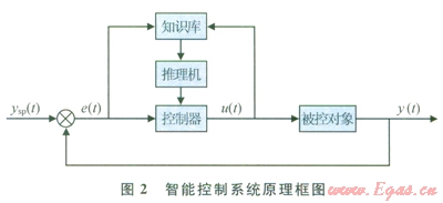 智能控制系統(tǒng)由知識庫、推理機及控制器組成,基本模型見圖2。圖2中u(t)為控制量,e(t)為偏差,ysp(t)為設定值,y(t)被控參數(shù)如流量、壓力、溫度等??刂屏?span lang="EN-US">u(t)與多種變量或事實相關,構成復雜的函數(shù)關系或變化規(guī)則。