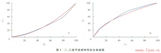 繪制擬合曲線和線性化補償反函數(shù)曲線(圖3)。二級節(jié)流閥開度(ST)與流量系數(shù)(CV)存在圖3-a藍色曲線所示關系,曲線表明兩者關系非線性比較嚴重,不利于流量均勻準確控制,必須進行線性化,以達到智能線性解耦控制。