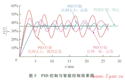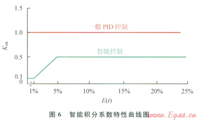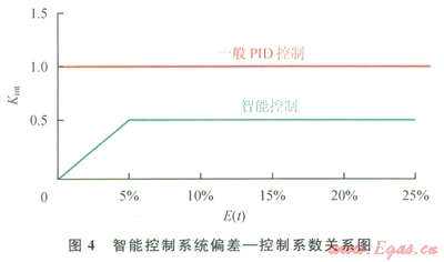可見,采用智能控制,可使偏差快速穩(wěn)定收斂,當[å|e(t)|/n]/Yset≥5%時,采用固定比例控制,當[å|e(t)|/n]/Yset≤5%時,采用一定時間(大約0.5個波動周期)相對偏差絕對值的均值(10/Yset)[ å|e(t)|/n]作為改變控制量的隨機變動系數(shù),智能系數(shù)Kint,與E(t)在5%以下時呈線性遞增關系,控制量u(t)與E(t)呈非線性遞增關系。