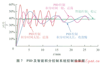 引用智能積分控制系數(shù),隨機改變積分強度,偏差越大、積分作用越強,偏差越小、積分作用越弱。效果見圖6、7,圖中縱坐標y(t)/Y表示被控參數(shù)與量程的百分比。