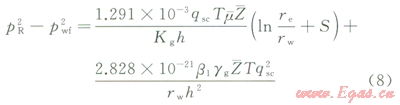 當(dāng)氣井產(chǎn)水,地層之中為氣水兩相流之時(shí),對(duì)氣相而言,式(1)中的參數(shù)滲透率應(yīng)該變成氣相滲透率。即對(duì)于氣水兩相流動(dòng)而言,氣井穩(wěn)定狀態(tài)條件下以壓力平方形式表示的氣相二項(xiàng)式產(chǎn)能方程為: