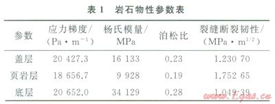 A井垂深2380m,水平井段長l828m,目標頁巖層在2370~2397m,層厚27m,基質滲透率為0.002mD,各層巖石物性參數(shù)如表1所示;本井共進表1巖石物性參數(shù)表行了七級清水壓裂,每一級有5簇射孔段,每一簇含8個射孔孔眼;選擇100目石英砂作為支撐劑,假設支撐劑在所有裂縫中均勻分布,沉降速率為1.27mm/min。兩個模型均假設縫網(wǎng)由兩簇分別垂直于最大、最小水平主應力的垂直縫組成,不含水平縫。