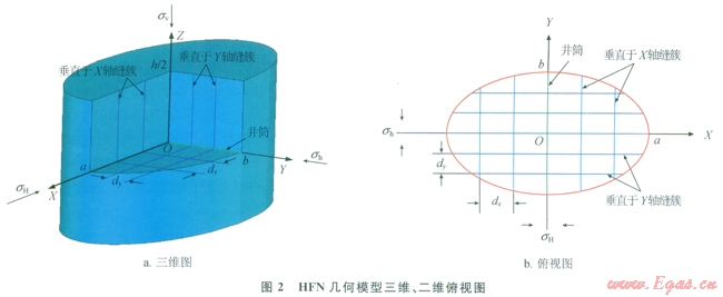 HFN模型考慮了壓裂過程中改造體積的實時擴展以及施工參數(shù)的影響,能夠對已完成壓裂進行縫網(wǎng)分析,同時可以基于該分析對之后的壓裂改造方案進行二次優(yōu)化設計。其不足之處在于模擬縫網(wǎng)幾何形態(tài)較為簡單,需借助于地球物理技術的幫助獲取部分參數(shù),同時由于不能模擬水平裂縫的起裂及擴展問題,及忽略了濾失問題,所以使用時具有較大的局限性。
