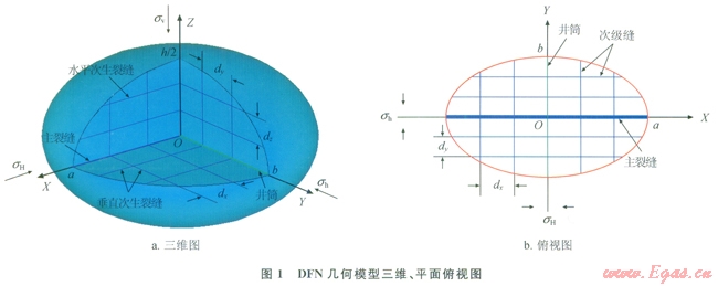 DFN模型基本假設如下:①壓裂改造體積為2a×2b×h的橢球體,由直角坐標系XYZ表征,X軸平行于最大水平主應力(sH)方向,Y軸平行于最小水平主應力(sh)方向,Z軸平行于垂向應力(sv)方向;②包含一條主裂縫及多條次生裂縫,主裂縫垂直于sh方向,在X-Z平面內擴展,次生裂縫分別垂直于X、Y、Z軸,縫間距分別為dx、dy、dz;③考慮縫間十擾及壓裂液濾失;④地層及流體不可壓縮。基于以上假設,作出DFN模型幾何模型的示意圖(圖1)。