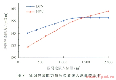 由圖8可知,隨著壓裂液泵入總量的增大,縫網(wǎng)導流能力增大;對于DFN模型,縫網(wǎng)導流能力從l45mD·m增大至l58mD·m,且當壓裂液泵入總量超過l200m3后,縫網(wǎng)導流能力基本保持不變;對于HFN模型,縫網(wǎng)導流能力從l34mD·m增大至l63mD·m。當壓裂液泵入總量低于l400m3時,DFN模型計算得到的縫網(wǎng)導流能力偏大;當壓裂液泵入總量高于1400m3時,HFN模型計算值偏大。