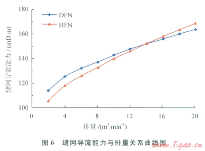 由圖6可知,隨著排量的增大,縫網(wǎng)導流能力增大;對于DFN模型,縫網(wǎng)導流能力從ll4mD·m增大至l63mD·m;對于HFN模型,縫網(wǎng)導流能力從106mD·m增大至169mD·m。當流量低于l4m3/min時,DFN模型計算的縫網(wǎng)導流能力偏大;當流量高于l4m3/min時,HFN模型計算值偏大。
