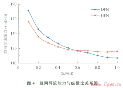縫網(wǎng)導流能力為縫網(wǎng)平均縫寬與縫網(wǎng)平均滲透率之積,反映了流體在縫網(wǎng)中的流動能力。由圖4可知:隨著縱橫比的增大,縫網(wǎng)導流能力降低;對于DFN模型,縫網(wǎng)導流能力從18lmD·m降低至117mD·m;對于HFN模型,縫網(wǎng)導流能力從l67mD·m降低至126mD·m。當縱橫比小于0.6時,DFN模型計算得到的縫網(wǎng)導流能力偏大;當縱橫比大于0.6時,HFN模型計算值偏大。