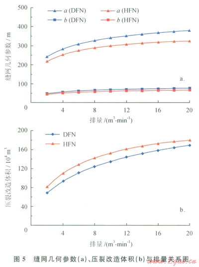 DFN模型和HFN模型計算所得縫網(wǎng)最大縫高分別為27.9m和27.2m,不隨排量的變化而變化。在其他條件相同的情況下,隨著排量的增大,a和b逐漸增大,壓裂改造體積逐漸增大;對于DFN模型,“由243m增加至380m,b由49m增大至76m,壓裂改造體積由68×104m3增大至169×104m3;對于HFN模型,以由218m增加至325m,b由44m增大至65m,壓裂改造體積由82×104m3增大至181×104m3。在相同排量下,利用DFN模型預測的縫網(wǎng)幾何參數(shù)比HFN模型預測值大(圖5-a);而利用DFN模型計算的壓裂改造體積比HFN模型計算值小(圖5-b)。