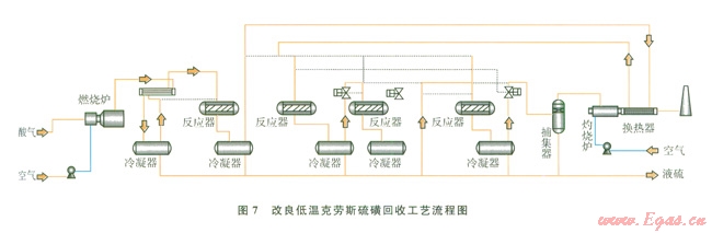 通過(guò)增加再生切換前的預(yù)冷步驟和再生前的冷凝去硫步驟進(jìn)行了流程創(chuàng)新,發(fā)明了改良低溫克勞斯硫磺回收工藝并形成了工藝設(shè)計(jì)包(圖7),硫磺回收率由常規(guī)克勞斯工藝的92%提高到99.45%,高于國(guó)外同類(lèi)工藝指標(biāo)。創(chuàng)新利用灼燒爐煙氣熱能作為再生熱源,回收熱能l l25 kW/a,已建成3套大型含硫天然氣凈化裝置。