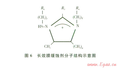 通過(guò)改進(jìn)緩蝕劑分子結(jié)構(gòu),引入巰基基團(tuán),增強(qiáng)了緩蝕劑的吸附成膜性能,與國(guó)外同類(lèi)產(chǎn)品相比緩蝕劑的膜持久時(shí)間由10 d提高到45 d。應(yīng)用了清管器預(yù)膜技術(shù),解決了長(zhǎng)距離管線(xiàn)緩蝕劑均勻保護(hù)和殘余藥劑回收的技術(shù)難題。首次在四川龍崗高含硫氣田進(jìn)行了全流程管線(xiàn)整體應(yīng)用清管器預(yù)膜技術(shù)。圖6為長(zhǎng)效膜緩蝕劑分子結(jié)構(gòu)示意圖。