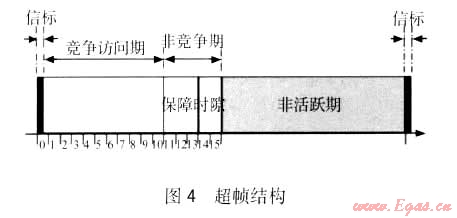 在IEEE802.15.4 MAC協(xié)議定義了超幀結(jié)構(gòu),如圖4所示。在幀群中存在兩個部分:活躍期與不活躍期(休眠期),在活躍期開放信道接入,休眠期關(guān)閉信道,進入休眠狀態(tài)以減少能耗。