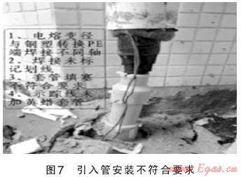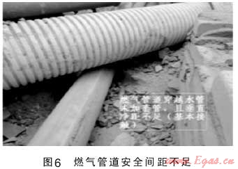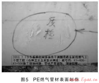 在燃?xì)夤艿朗┕み^程中,因施工單位人員、現(xiàn)場監(jiān)理人員以及建設(shè)單位現(xiàn)場管理人員對燃?xì)夤艿腊惭b施工質(zhì)量監(jiān)管不到位,施工經(jīng)驗(yàn)不足或者根本不懂燃?xì)夤艿朗┕さ闹匾裕话凑杖細(xì)庑袠I(yè)國家規(guī)范和行業(yè)標(biāo)準(zhǔn)嚴(yán)格操作和監(jiān)管,產(chǎn)生一系列施工質(zhì)量隱患。如鋼管防腐處理不到位、閥井內(nèi)波紋補(bǔ)償器受外力安裝偏斜或不同軸,電熔管件焊接焊口冷卻采取沖水冷卻方式,PE管道運(yùn)輸、搬運(yùn)造成管壁劃傷嚴(yán)重超標(biāo)等人為因素,給城市燃?xì)夤艿腊踩\(yùn)行種下了一顆顆定時炸彈(如圖3、4、5)。