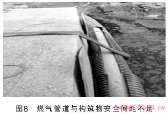 主要表現(xiàn)在:1)對壓力管道安全知識缺乏和對壓力管道有關(guān)介質(zhì)(如液化石油氣和天然氣)安全知識貧乏;2)對安全距離重視不足,壓力管道與其它設(shè)施距離不符合規(guī)范(GB50028-2006)相關(guān)要求,壓力管道與生活設(shè)施安全距離不足;3)無安全操作制度或有規(guī)定要求不嚴(yán)格執(zhí)行(如圖6、7、8)。
