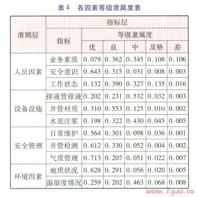 用模糊層次分析法最終的計算的評價結果為7.008,則此地下儲氣井的總體安全評價值介于7~9范圍,根據(jù)“大于原則”,說明該CNG地下儲氣井的安全等級可以評價為“良”。同時,針對安全級別較低的指標制定應對的策略,從而實現(xiàn)對CNG地下儲氣井安全的整體控制。