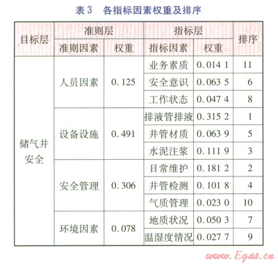 匯總各準則層因素與指標層因素對于儲氣井安全目標的權重,即可以排出各指標因素對儲氣井安全權重的順序。以某CNG地下儲氣井為例,利用層次分析法,把相關各指標因素進行綜合評定,并且進行歸一化處理,見表3。