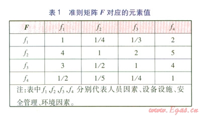 此處利用方根法計算,用兩兩比較求出各元素的相對重要程度,其準則矩陣F對應的元素值見表1。