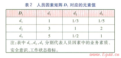 利用方根法計算,可以得出指標層對準則層各因素的權重,人員因素矩陣D1對應的元素值見表2。