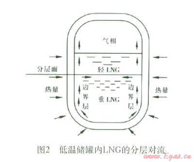 渦旋主要是由于在向盛有LNG的低溫儲罐中充注新的LNG液體或者LNG中氮蒸發(fā)而使儲罐內(nèi)的液體發(fā)生分層。分層液體在儲罐周邊漏熱的作用下,形成各自獨(dú)立的自然對流循環(huán),進(jìn)而使各層液體的密度不斷發(fā)生變化,見圖2。當(dāng)相鄰兩層液體的密度近似相等時(shí),兩個(gè)液層就會發(fā)生強(qiáng)烈混合,下層積聚的熱量突然釋放出來,同時(shí)伴隨著LNG表面蒸發(fā)率的驟增,幾乎可達(dá)到正常情況下蒸發(fā)率的250倍。蒸發(fā)產(chǎn)生的大量氣體,引起儲罐內(nèi)壓力突然增大,導(dǎo)致大量天然氣排空,造成嚴(yán)重浪費(fèi),甚至可能毀壞儲罐及工藝系統(tǒng),引起爆炸或火災(zāi),嚴(yán)重威脅人員和財(cái)產(chǎn)安全。