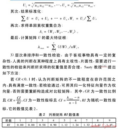 2)構(gòu)造判斷矩陣并求最大特征根。根據(jù)已建立的因素層次分析結(jié)構(gòu)圖對(duì)各影響因素進(jìn)行兩兩對(duì)比分析,構(gòu)造判斷矩陣進(jìn)行計(jì)算,求解判斷矩陣的最大特征根λmax及與其對(duì)應(yīng)的正規(guī)化特征向量,具體計(jì)算步驟為:首先,計(jì)算各行中元素乘積的n次方根: