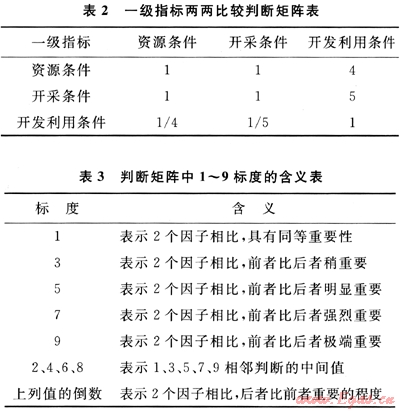 煤層氣勘查潛力指標(biāo)體系分為4層,其中目標(biāo)層為綜合評價值,準(zhǔn)則層有3層(分為三級指標(biāo))。下面以一級指標(biāo)權(quán)重計(jì)算為例,描述層次分析法確定權(quán)重的過程。專家討論后的打分結(jié)果見表2。專家打分時一般采用數(shù)字1~9及其倒數(shù)作為重要性標(biāo)度,其含義見表3,計(jì)算方法參見本文參考文獻(xiàn)[15]。